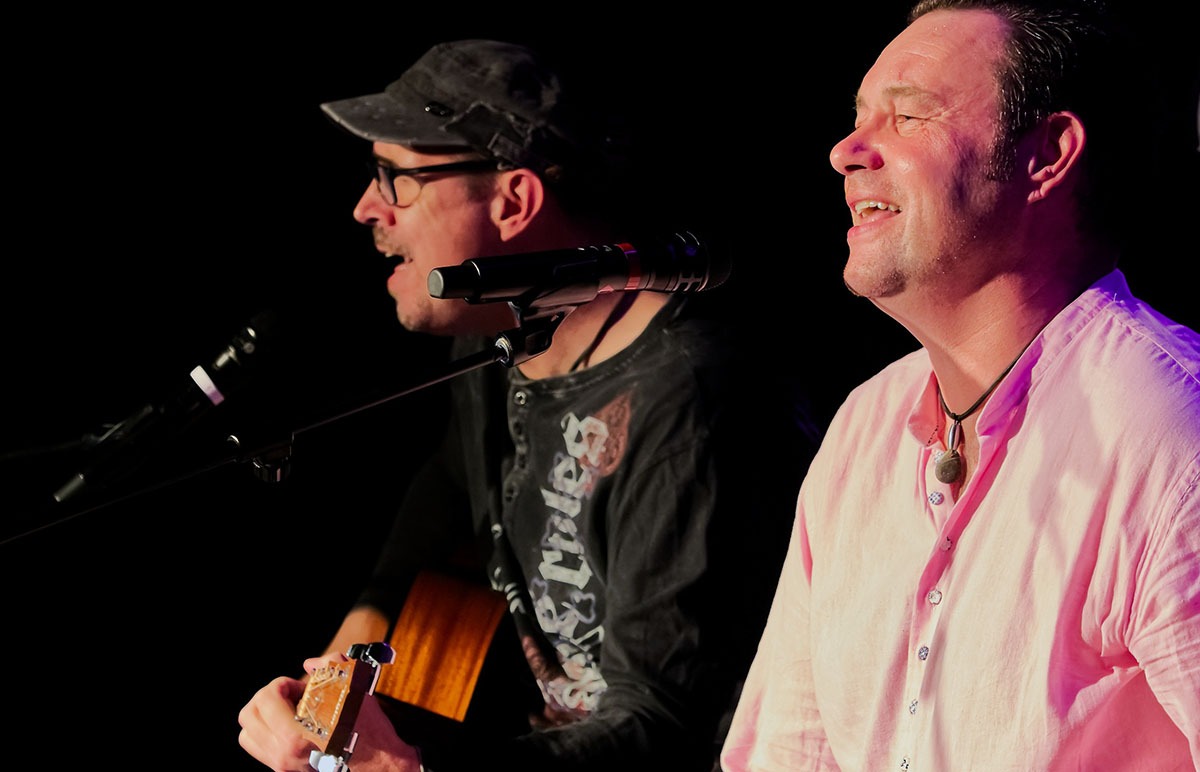 Michael Angenendt und Jochen Küper als Akustik Duo schaffen mit zweistimmigem Gesang und feinem Gitarrensound eine besondere Atmosphäre. Bei minimalistischen, „unplugged“ interpretierten Klassikern von Sting, The Police, Crowded House, The Beatles, George Michael oder Billy Idol laden sie zum Lauschen, Eintauchen und Mitgehen ein. Und wenn das Mitgehen zu Schnipsen, Klatschen, Mitsingen oder Tanzen führen sollte – prima – schlichtweg ein gemeinsames Erleben toller Musik.